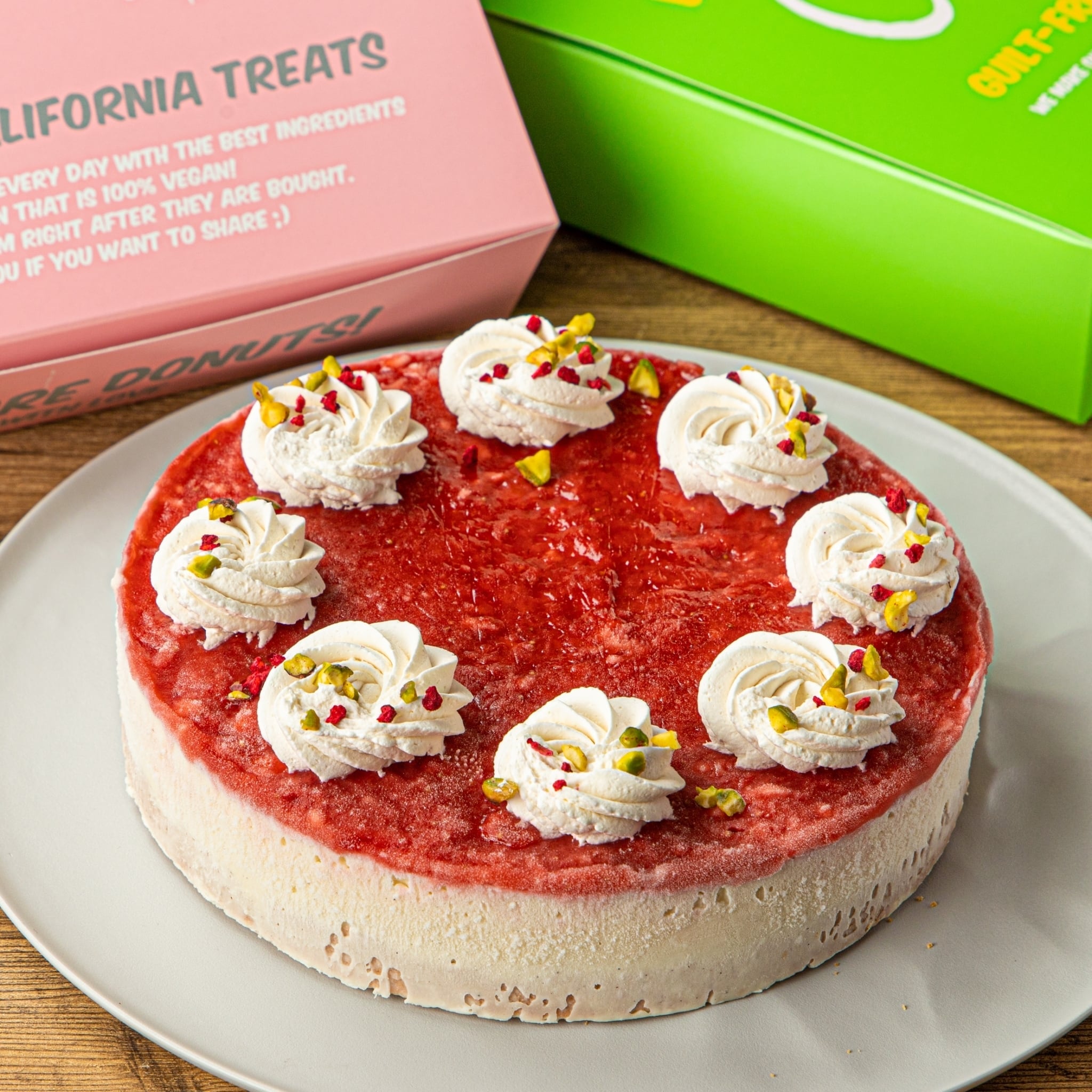 豆乳やオリーブオイルから作られた濃厚でクリーミーなチーズをふんだんに使った、ストロベリーレアチーズケーキが出来上がりました。